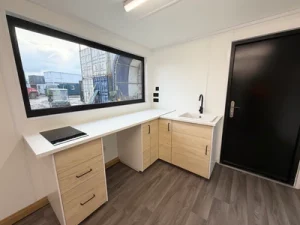 1 x L-shape kitchenette with water heater, basin, mixer tap, work top run & storage units with electric hob!