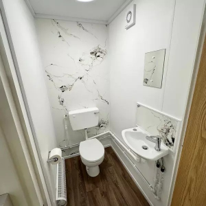 New Fully installed WC/Wash Room including, WC, wash basin, water heater, loo roll holder, extractor fan, internal LED light with seperate internal switch, single wall tube heater & marble effect splash back.